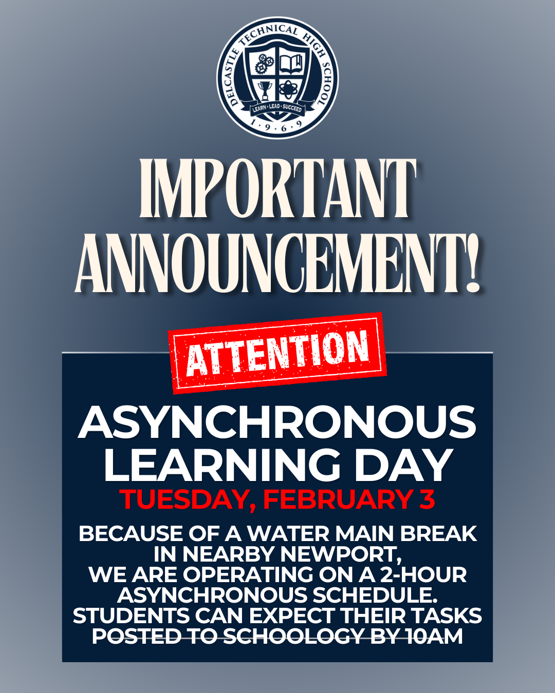 Due to a water main break in a nearby community, Delcastle has been switched to an Asynchronous Learning Day. Students can expect their day's tasks to be posted on Schoolgy by 10:00 a.m. Thank you for your cooperation.